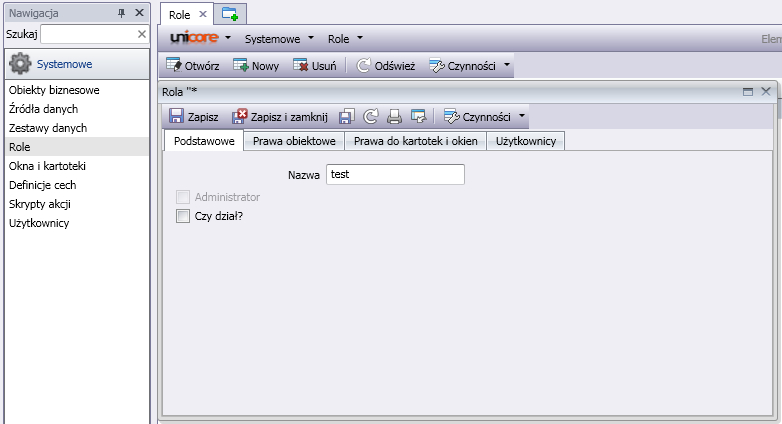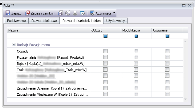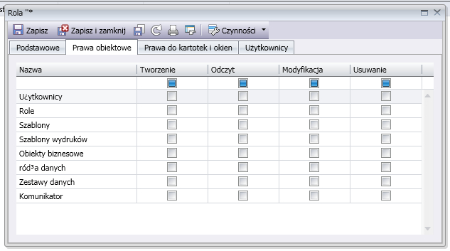 Nie jest zalecane nadawanie w prawach obiektowych, kartotekach i oknach uprawnień do usuwania innym użytkownikom niż użytkownicy z rolą administrator.