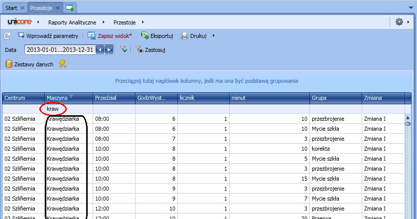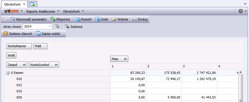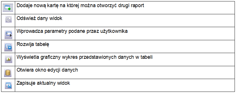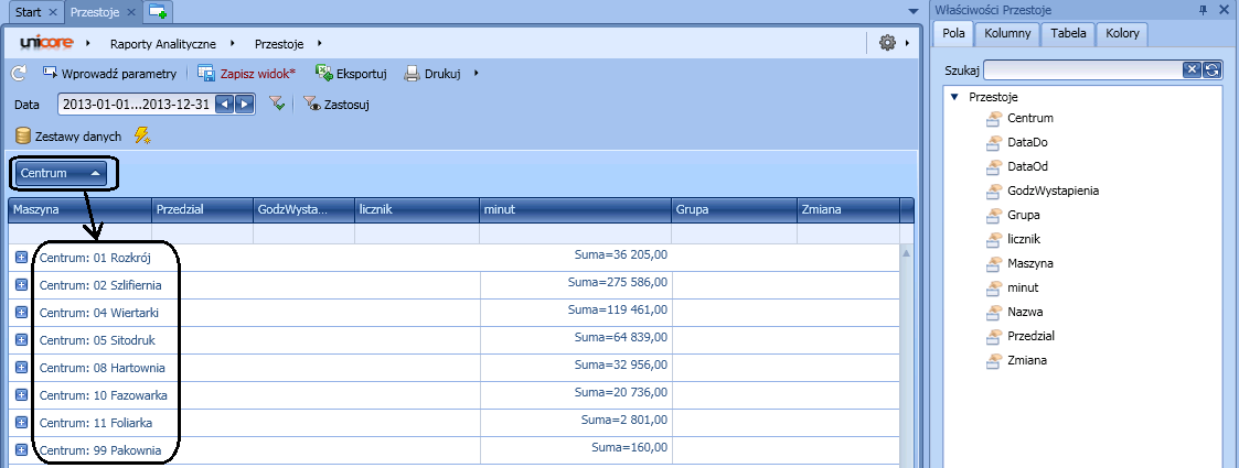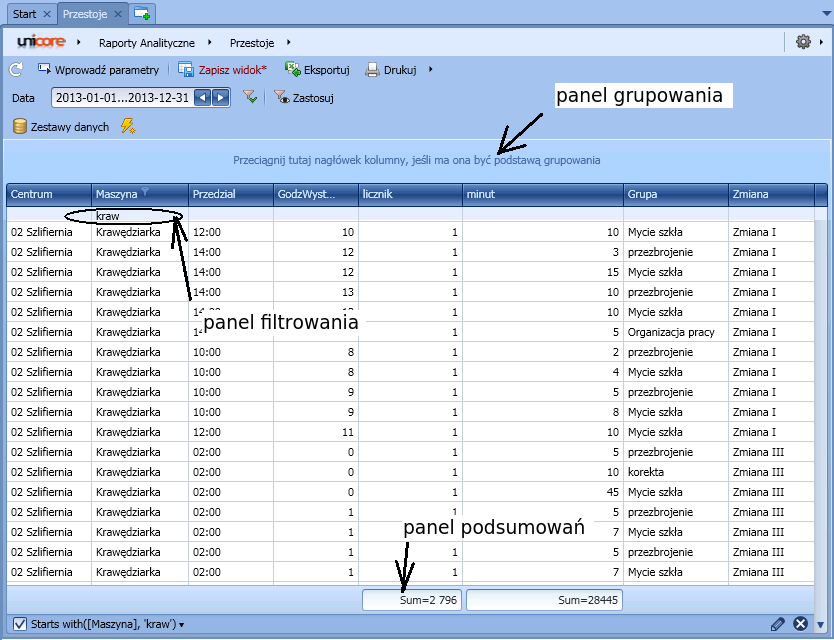 Zakładka „tabela” pozwala dostosować widok raportu do potrzeb użytkownika, np. ukryć/pokazać panel grupowania