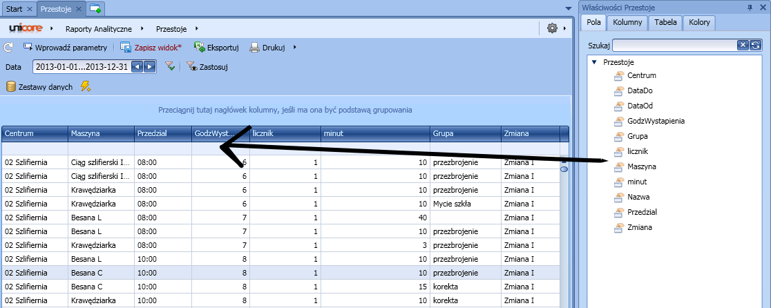 Przeciągnięcie nagłówka kolumny na panel grupowania