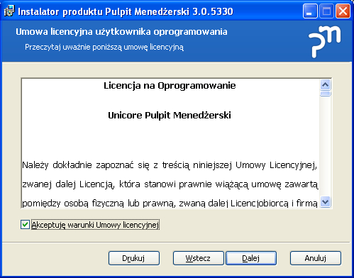 Wyświetlana jest umowa licencyjna użytkownika którą należy uważnie przeczytać i akceptować jej warunki.