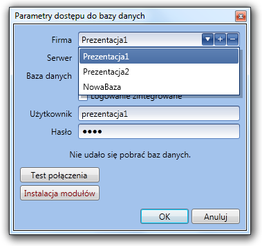- Baza danych – wpisując nazwę bazy danych, do której będziemy się łączyć (pole Firma zostanie automatycznie wypełnione nazwą bazy danych)