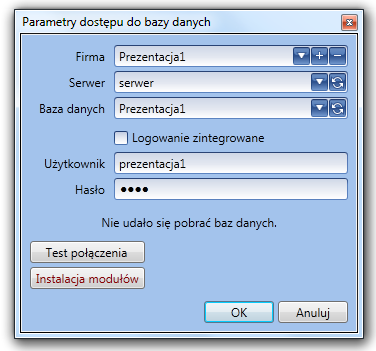 Po wypełnieniu pól klikamy przycisk Test połączenia, który sprawdza poprawność połączenia z serwerem bazodanowych oraz czy schemat bazy danych jest aktualny. Jeśli pojawi się komunikat ‘schemat bazy danych jest nieaktualny’ należy kliknąć przycisk Instalacja modułów, który wywoła aktualizację schematu bazy danych.