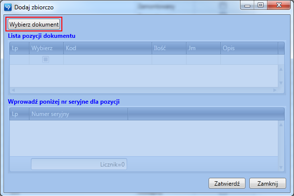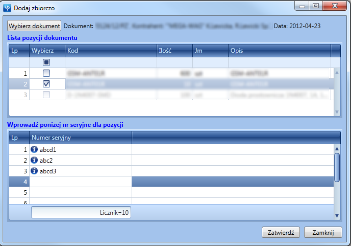- Dodaj zbiorczo – Przypisywanie numerów seryjnych dla towarów z wybranego dokumentu magazynowego