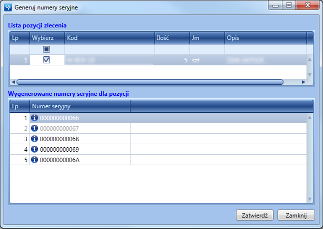 Należy wypełnić pozycje numerami seryjnymi po czym zatwierdzić przyciskiem “Zatwierdź”. W bazie zostaną zapisane rekordy wiążące artykuły z numerami seryjnymi