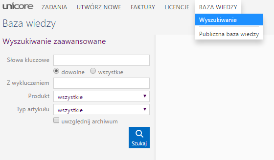 Klient posiada możliwość wyszukiwania konkretnych rozwiązań za pomocą wyszukiwarki w bazie wiedzy.
