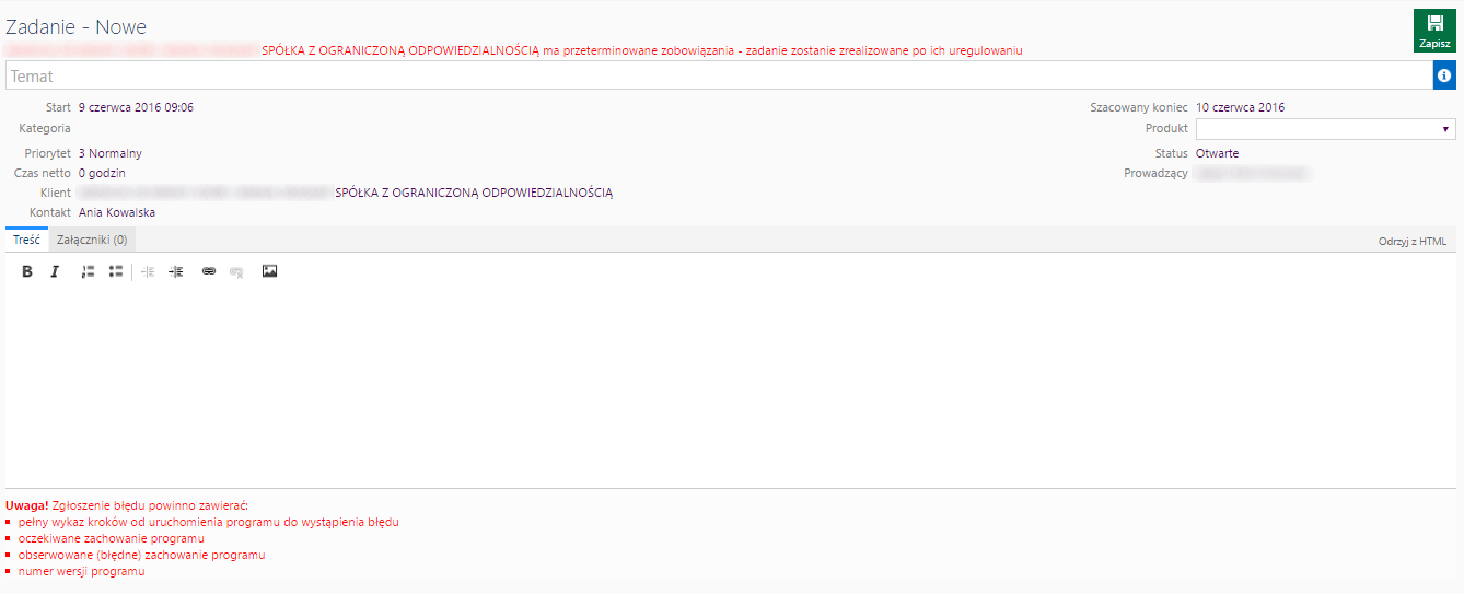 Nowe zadanie musi zawierać tytuł, treść oraz produkt.