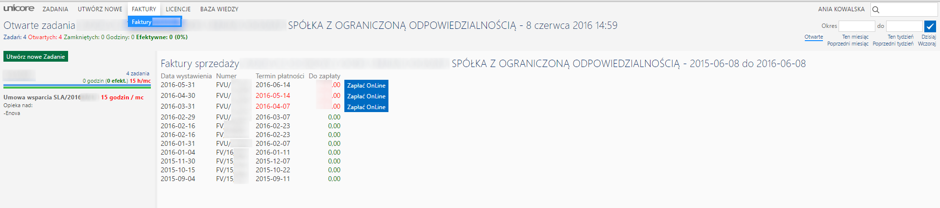 W zakładce „faktury” mamy wgląd do naszych faktur dotyczących wsparcia Unicore.