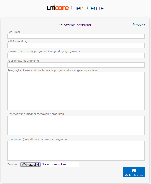 Po wpisaniu w pasku adresu pomoc.unicore.pl, pojawi się formularz zgłoszeniowy.