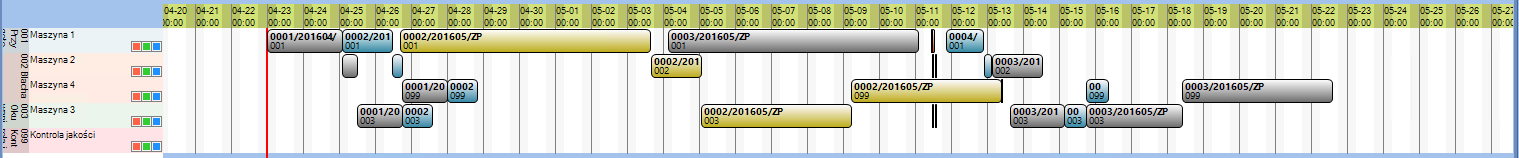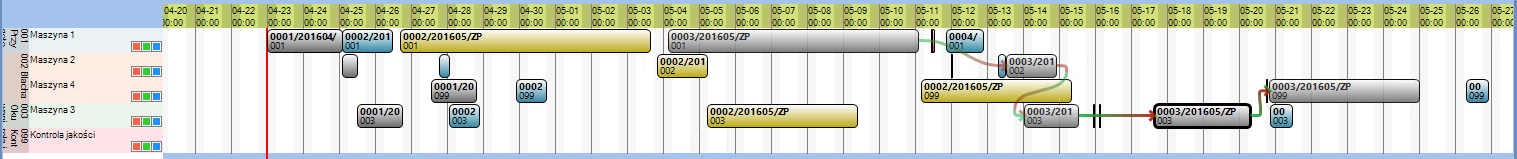 Jak widać powyżej program zoptymalizował rozmieszczenie procesów technologicznych, eliminując czasy przestojów maszyn tam gdzie było to możliwe, zachowując ciągłość poszczególnych zleceń produkcyjnych. Po wykonaniu optymalizacji procesów czas produkcji wszystkich zaplanowanych zleceń skrócił się o ponad 4 dni.