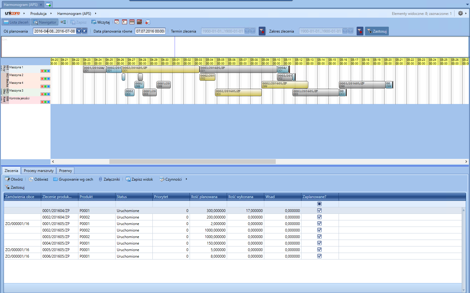 Program Unicore Produkcja wyposażony jest w zaawansowany mechanizm harmonogramowania i planowania APS (advanced planning and scheduling), który pozwala zaplanować procesy produkcji w firmie w możliwie najbardziej optymalny sposób, rozdzielając poszczególne procesy produkcyjne pomiędzy odpowiednie maszyny w ramach jednego stanowiska roboczego, uwzględniając zdefiniowane wcześniej normy czasowe dla każdego procesu na maszynach zdolnych daną czynność wykonywać.
